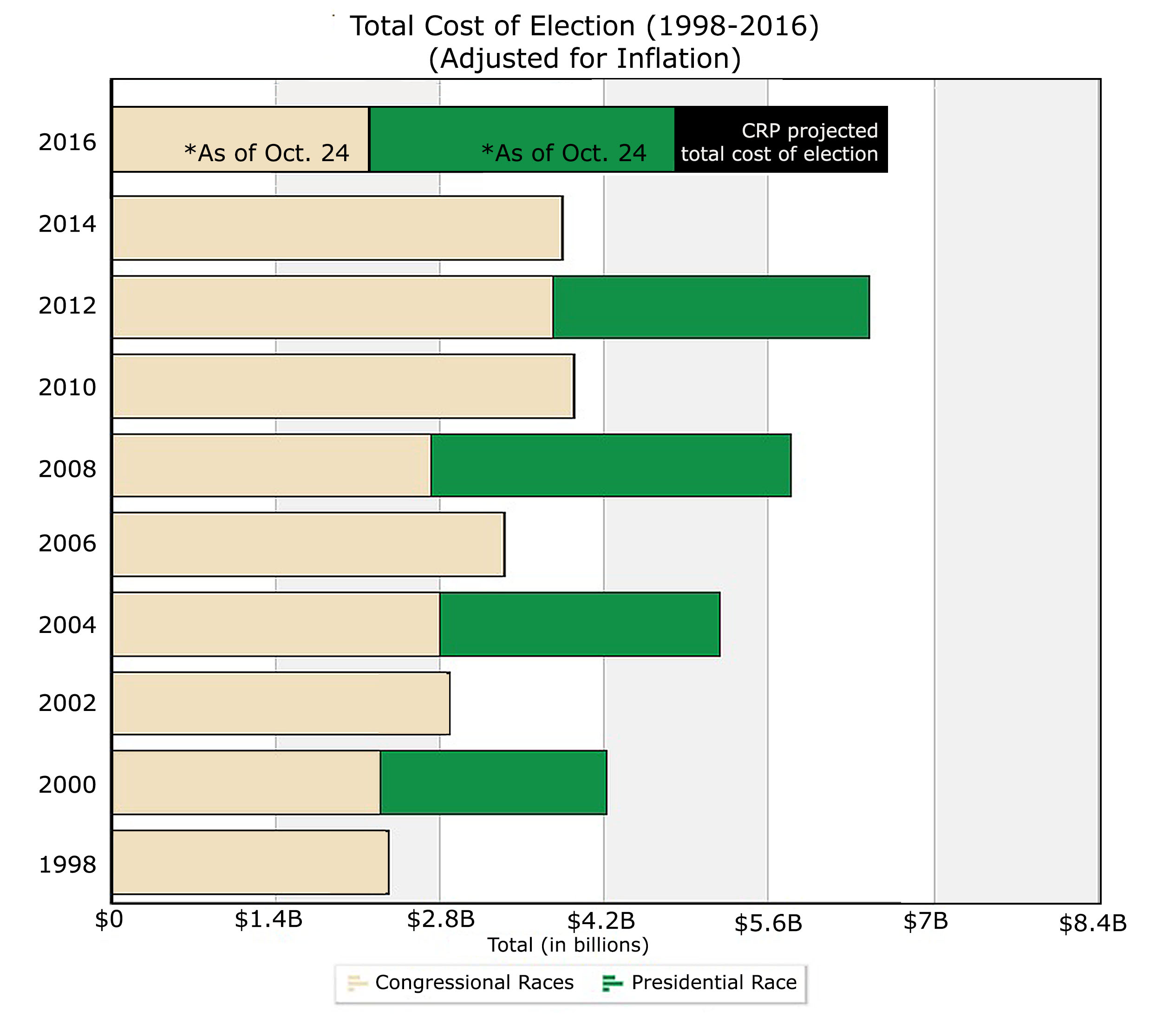 From the years 1998-2018, the United States will have spent an estimated $44 billion (see below) in electing its congress and presidents – bear in mind this is just what is spent on elections at the federal level. The cost of the presidential election has increased over 85 percent and congressional election cost have increased a blistering 169 percent. Meanwhile, average hourly earnings of all employees has increased by only 30 percent in the same period. There is no doubt that our sibling site, HBCU Money can attest, that this makes little economic sense for a country that is in the grasp of globalization and automation. Capital that needs to be direly used elsewhere is being siphoned by the political industrial complex to maintain a firm grip on their institutional power by both Democrats and Republicans alike. Politics is more big business than population representation – and that business is booming as the aforementioned numbers point out.
